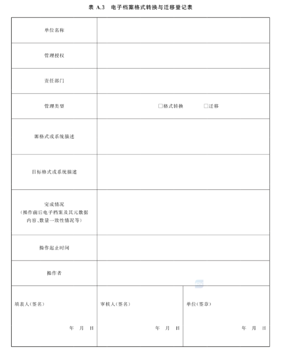 10.2.5 電子檔案及其元數(shù)據(jù)庫(kù)的轉(zhuǎn)換、遷移活動(dòng)應(yīng)記錄于電子檔案管理過程元數(shù)據(jù)中,并填寫電子檔案格式轉(zhuǎn)換與遷移登記表(見表 A.3)。