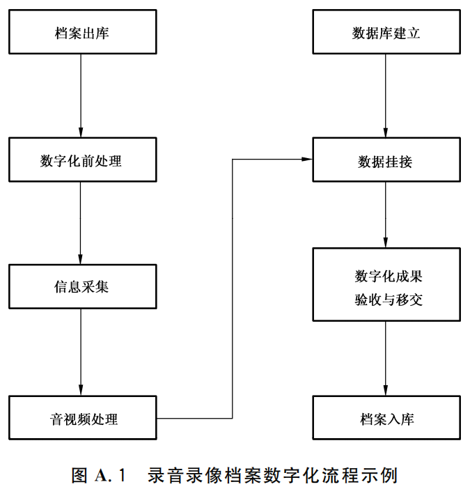 5.5.1 應(yīng)依照相關(guān)法律法規(guī)和各類技術(shù)標(biāo)準(zhǔn) ,制定相關(guān)的工作流程和各環(huán)節(jié)操作規(guī)范等 ,對(duì)錄音錄像 檔案數(shù)字化全過(guò)程進(jìn)行有效的控制 ,確保數(shù)字化成果質(zhì)量。錄音錄像檔案數(shù)字化流程示例參見(jiàn)附錄A。