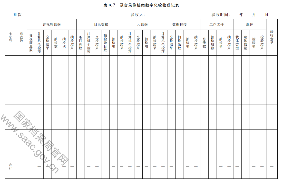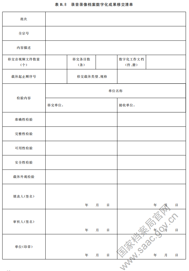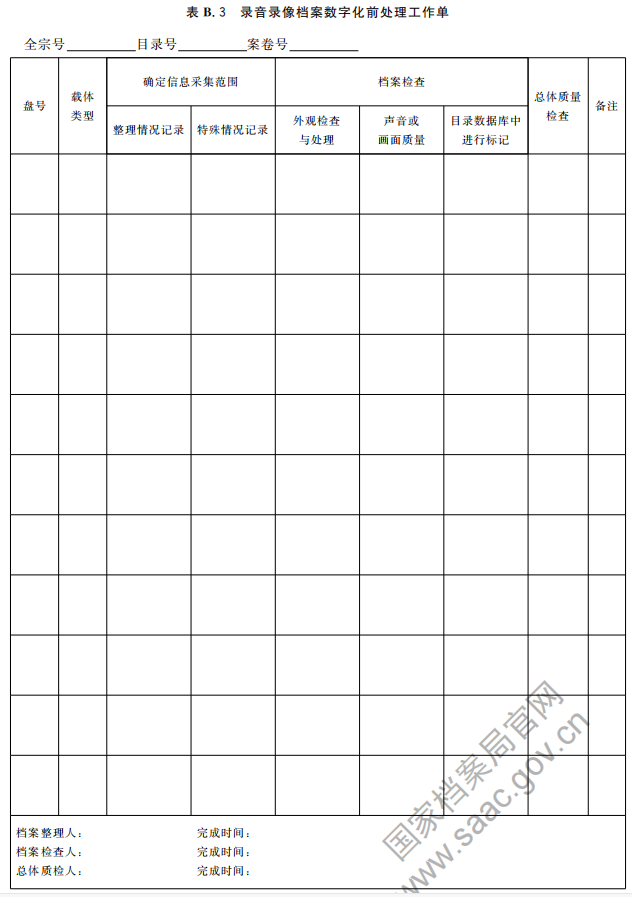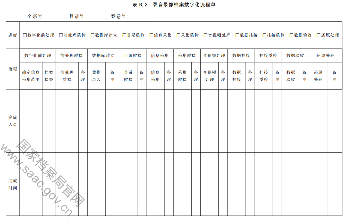 5.6.1 應(yīng)根據(jù)情況制定符合實(shí)際要求的錄音錄像檔案數(shù)字化工作文件 ,以此加強(qiáng)對(duì)數(shù)字化工作的管 理 。 主要包括錄音錄像檔案數(shù)字化工作方案、數(shù)字化審批書、數(shù)字化流程單、數(shù)據(jù)驗(yàn)收單、項(xiàng)目鑒定驗(yàn)收 報(bào)告、數(shù)字化成果移交清單等 。采取外包方式實(shí)施時(shí) ,還應(yīng)包括項(xiàng)目招標(biāo)文件、投標(biāo)文件、中標(biāo)通知書、 項(xiàng)目合同、保密協(xié)議等 。部分工作文件示例參見(jiàn)附錄B。