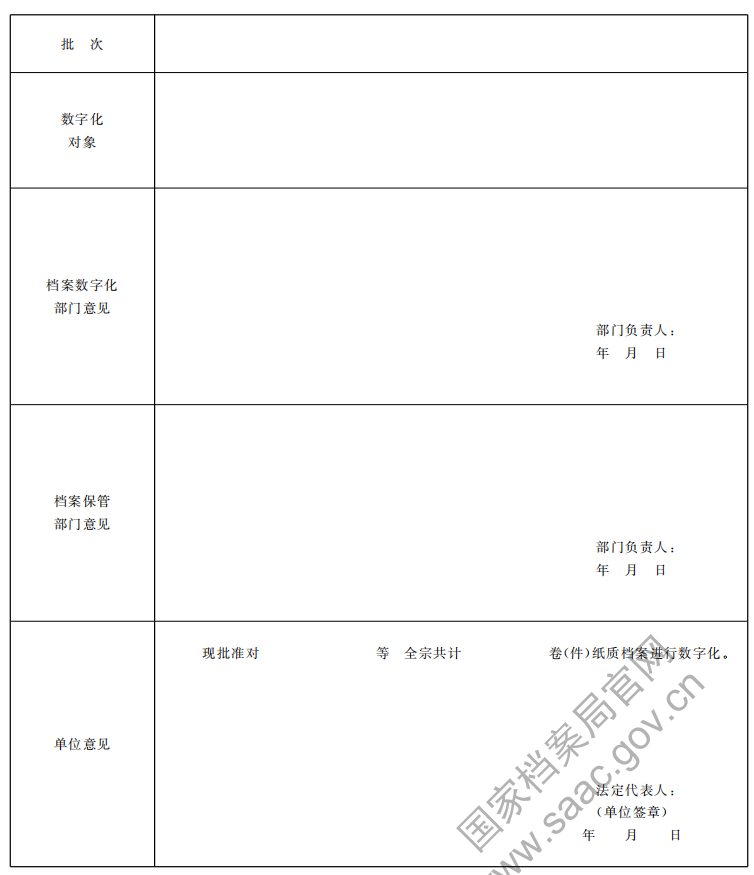 5.6.1 應(yīng)根據(jù)情況制定符合實(shí)際要求的紙質(zhì)檔案數(shù)字化工作文件 ,以此加強(qiáng)對(duì)數(shù)字化工作的管理。主要包括紙質(zhì)檔案數(shù)字化工作方案、紙質(zhì)檔案數(shù)字化審批書(shū)、紙質(zhì)檔案數(shù)字化流程單、數(shù)據(jù)驗(yàn)收單、項(xiàng)目驗(yàn) 收?qǐng)?bào)告、紙質(zhì)檔案數(shù)字化成果移交清單等 ,采取外包方式實(shí)施時(shí) ,還應(yīng)包括項(xiàng)目招標(biāo)文件、投標(biāo)文件、中標(biāo)通知書(shū)、項(xiàng)目合同、保密協(xié)議等 。部分工作文件示例參見(jiàn)附錄B。