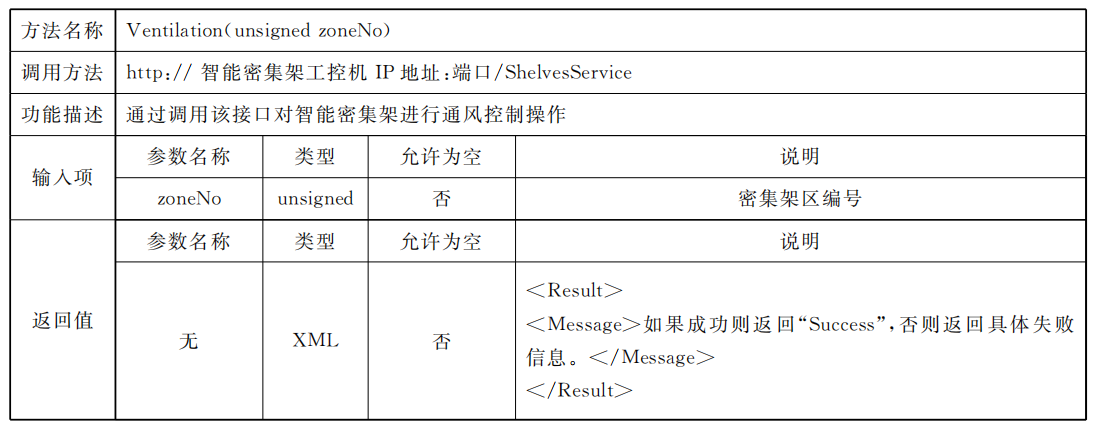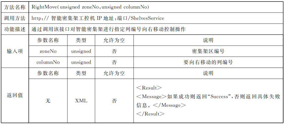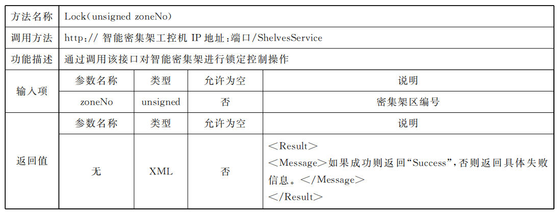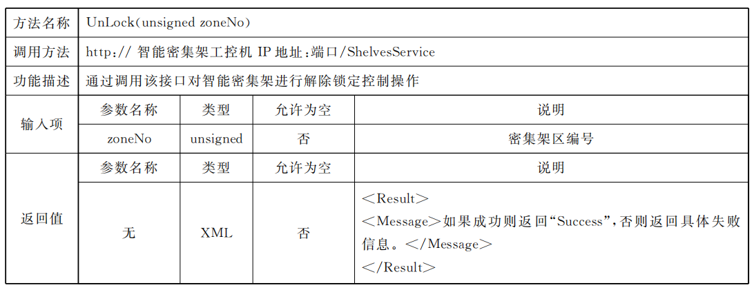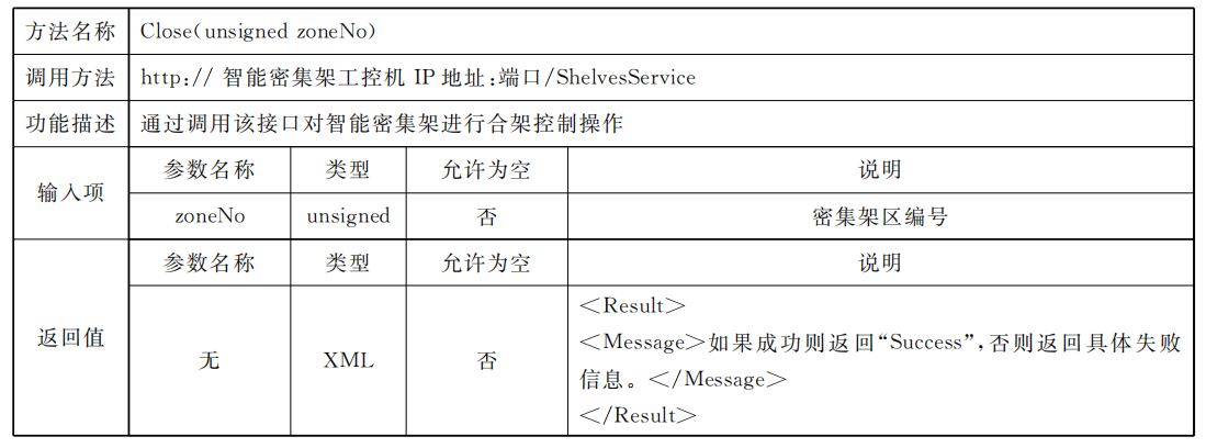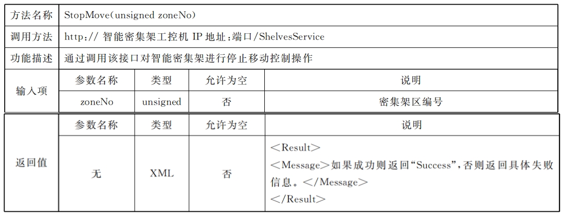 密集架控制系統(tǒng)應同時具備總線協(xié)議方式以及Web Service協(xié)議方式,供外部設(shè)備或外部應用進行調(diào)用總線協(xié)議標準采用RS485接口,通過區(qū)域控制總線進行通信,但不排除同時使用其他總線通信方式的可能,總線通信協(xié)議見附錄A;Web Service通信應滿足數(shù)據(jù)傳輸安全要求,網(wǎng)絡(luò)通信協(xié)議見附錄B。