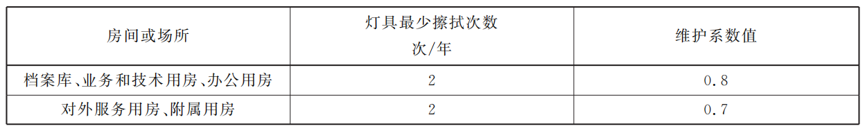 5.1.2 在照明設(shè)計(jì)時(shí),應(yīng)根據(jù)環(huán)境污染特征和燈具擦拭次數(shù)從表6中選定相應(yīng)的維護(hù)系數(shù)。