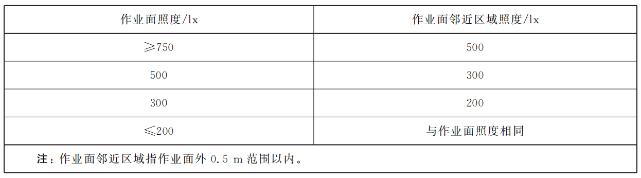 5.2.2 作業(yè)面鄰近區(qū)域的照度可低于作業(yè)面照度,但不宜低于表7的數(shù)值。