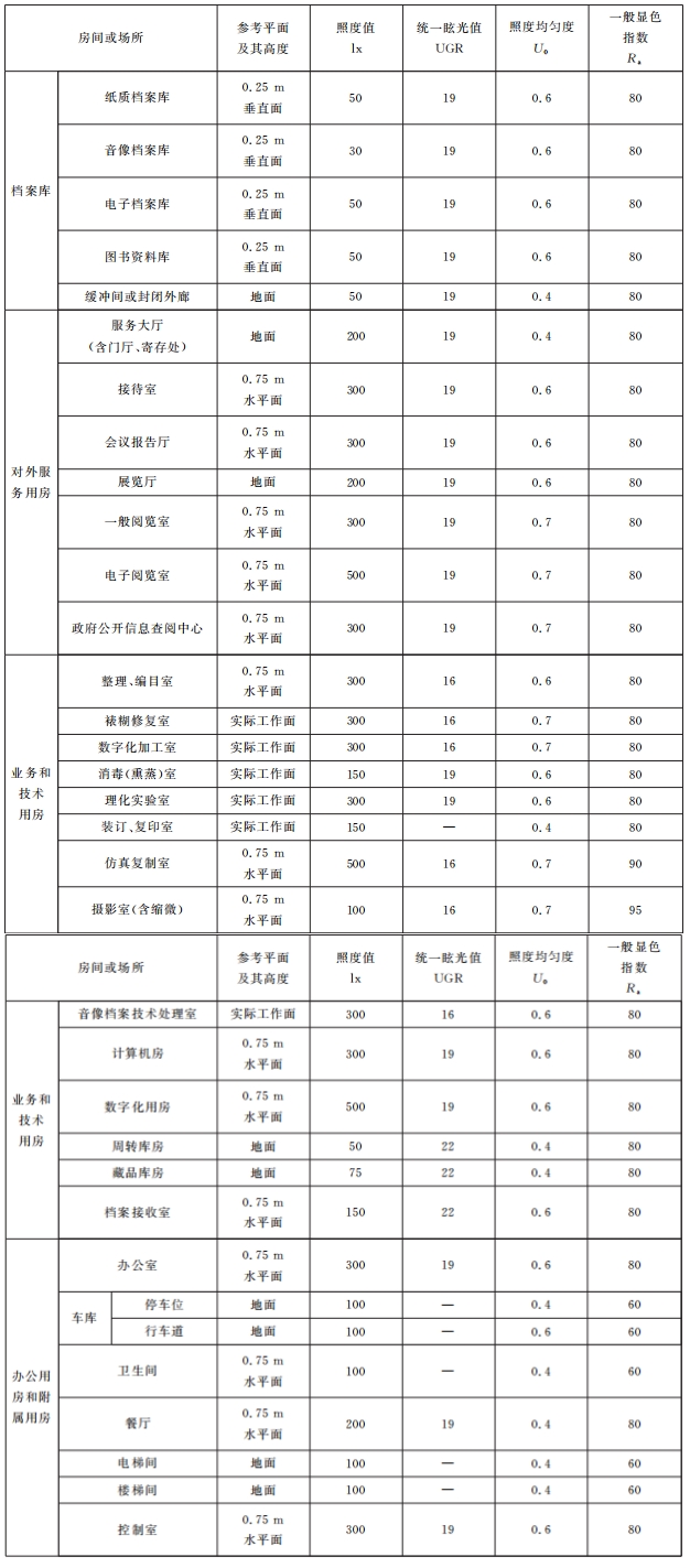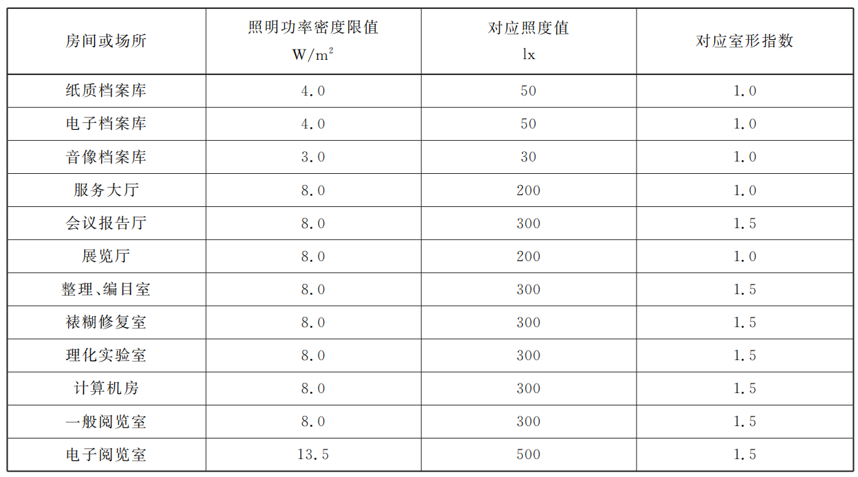 表14 檔案館有關(guān)房間或場(chǎng)所的照明功率密度限值