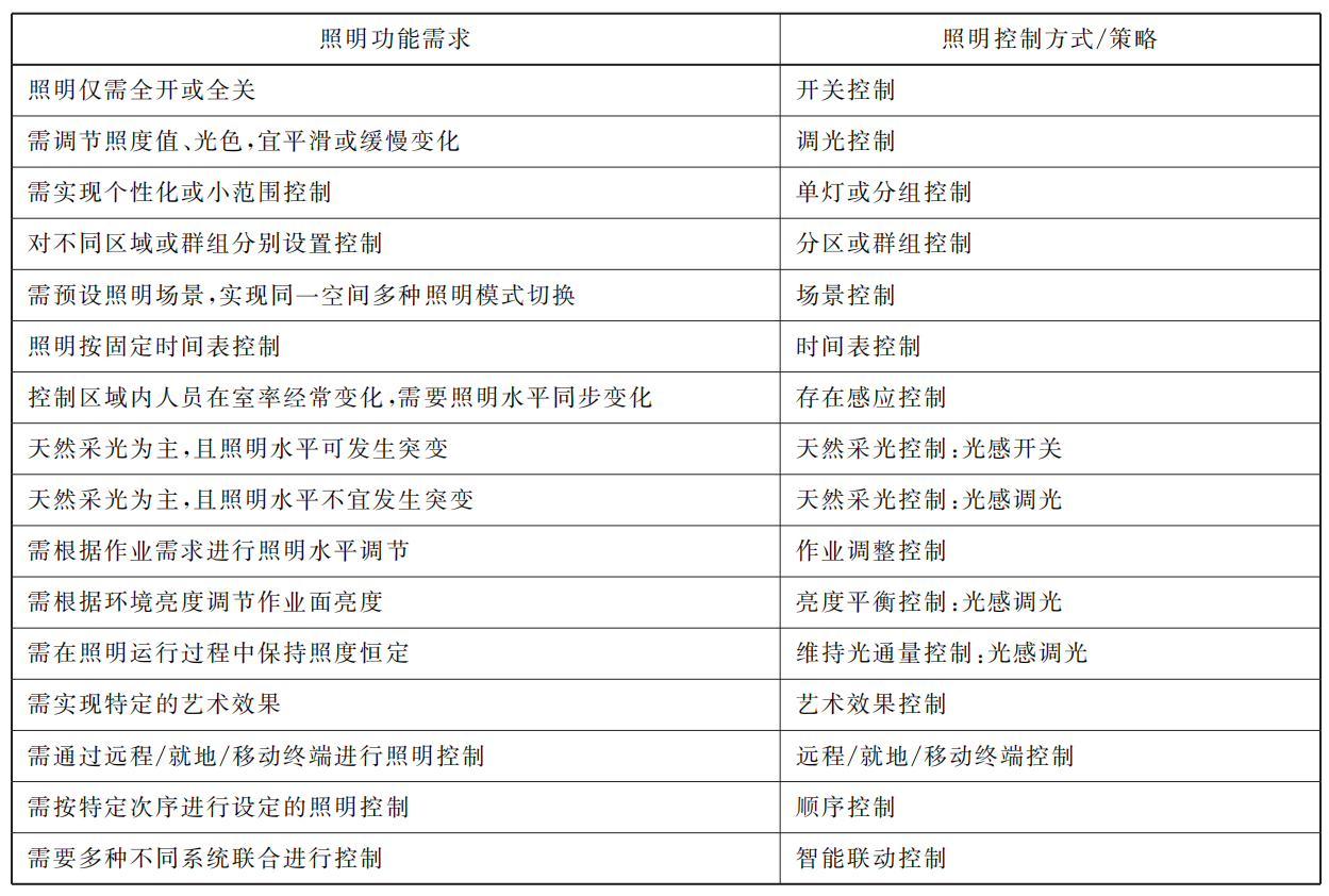 表15 照明功能需求對(duì)應(yīng)的照明控制方式/策略