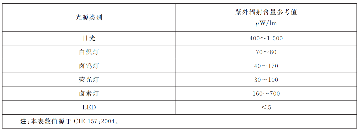 表 A.1 各類裸光源的紫外輻射含量參考值