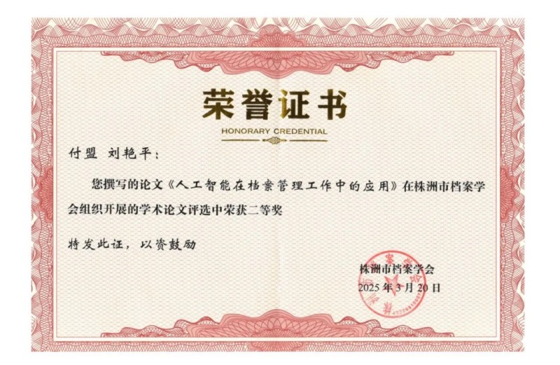 德爾斐科技公司榮獲株洲市檔案學(xué)會2024年度先進(jìn)單位、付盟總經(jīng)理個人獲優(yōu)秀組長、學(xué)會論文評選二等獎。