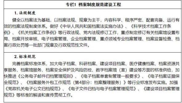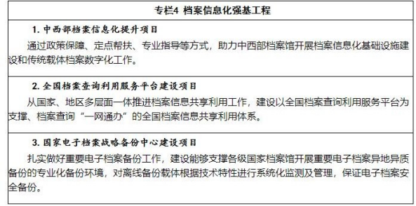 18.加速數(shù)字檔案館(室)建設(shè)。推進(jìn)機(jī)關(guān)、團(tuán)體、企業(yè)事業(yè)單位和其他組織建設(shè)與業(yè)務(wù)系統(tǒng)相互銜接的電子檔案管理信息系統(tǒng)。加大機(jī)關(guān)數(shù)字檔案室建設(shè)力度,新增30家高水平的數(shù)字檔案室。深入開(kāi)展企業(yè)數(shù)字檔案館(室)建設(shè),完成50家企業(yè)集團(tuán)數(shù)字檔案館(室)建設(shè)試點(diǎn)。各級(jí)國(guó)家檔案館全面建成檔案信息管理系統(tǒng),大力推進(jìn)數(shù)字檔案館建設(shè),建設(shè)中央檔案館數(shù)字檔案館,新增150家高水平的數(shù)字檔案 館。加強(qiáng)大數(shù)據(jù)、人工智能等新一代信息技術(shù)在數(shù)字檔案館(室)建設(shè)中的應(yīng)用,推動(dòng)數(shù)字檔案館(室)建設(shè)優(yōu)化升級(jí)。加強(qiáng)電子檔案長(zhǎng)期保存技術(shù)和管理研究,創(chuàng)建科學(xué)的可信存儲(chǔ)與驗(yàn)證體系,保證電子檔案真實(shí)性、完整性、可用性、安全性。