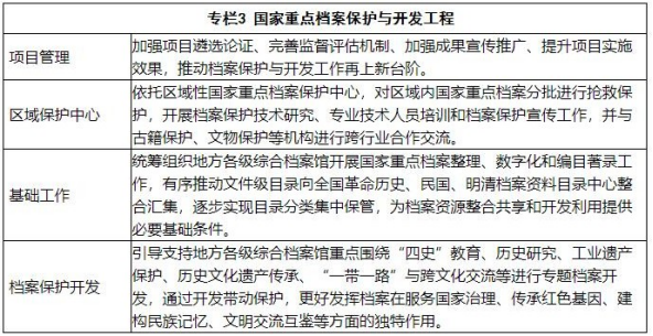 6.拓展檔案資源收集范圍。加強(qiáng)國(guó)家重大發(fā)展戰(zhàn)略和地方中心工作等重點(diǎn)領(lǐng)域檔案收集工作,著力全方位收集反映黨史、新中國(guó)史、改革開(kāi)放史、社會(huì)主義發(fā)展史的檔案材料,促進(jìn)珍貴檔案國(guó)內(nèi)外征集工作。加大關(guān)系國(guó)家安全、國(guó)計(jì)民生、公共服 務(wù)、新興產(chǎn)業(yè)等重點(diǎn)行業(yè)檔案收集工作,健全重大活動(dòng)、突發(fā)事件應(yīng)對(duì)活動(dòng)檔案工作機(jī)制,著力健全重特大事件應(yīng)急處置檔案管理機(jī)制,做好相關(guān)材料歸檔和檔案接收、征集、整理工作,鼓勵(lì)開(kāi)展口述材料、新媒體信息的采集。開(kāi)展國(guó)有檔案資源普查, 基本摸清國(guó)有檔案資源家底。研究探索非國(guó)有檔案資源登記制度。實(shí)施新時(shí)代新成就國(guó)家記憶工程。