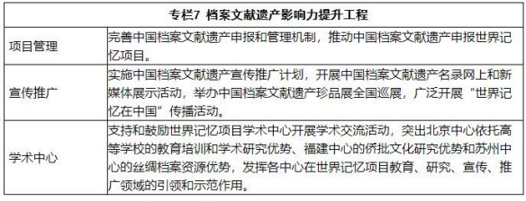26.積極參與聯(lián)合國(guó)教科文組織世界記憶項(xiàng)目。加強(qiáng)與聯(lián)合國(guó)教科文組織世界記憶項(xiàng)目秘書(shū)處和國(guó)際咨詢(xún)委員會(huì)合作,積極參與世界記憶項(xiàng)目亞太地區(qū)委員會(huì)各項(xiàng)活動(dòng)。加強(qiáng)統(tǒng)籌謀劃,促進(jìn)入選文獻(xiàn)研究和宣傳推廣。促進(jìn)世界記憶項(xiàng)目與聯(lián)合國(guó)教科文組織其他遺產(chǎn)項(xiàng)目協(xié)同發(fā)展。發(fā)揮世界記憶項(xiàng)目北京、福建和蘇州等學(xué)術(shù)中心作 用。實(shí)施檔案文獻(xiàn)遺產(chǎn)影響力提升工程。