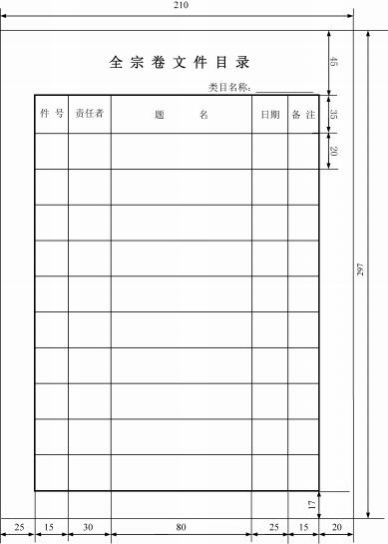 8. 2 全宗卷文件目錄采用 A4(長 ×寬為 297 mm×210 mm) 紙張 、表格形式,設置“類目名稱”“件號”“責 任者”“題名”“日期”“備注”等項目。目錄式樣見圖 A. 2。