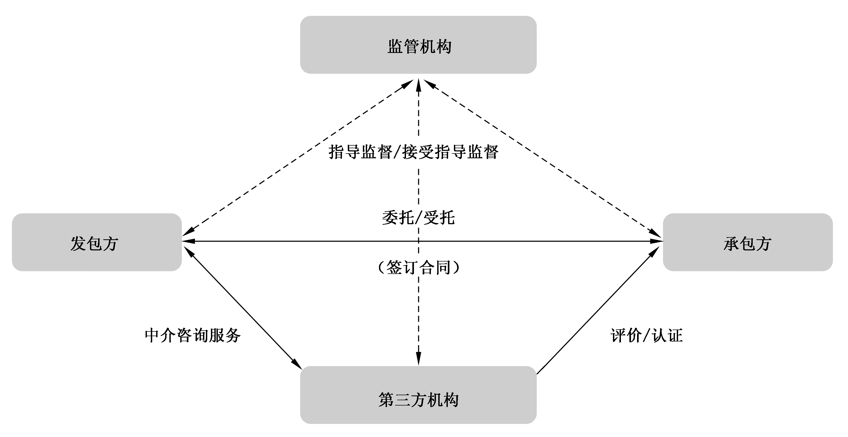 5.1 檔案服務(wù)外包工作中主要涉及發(fā)包方、承包方、第三方機(jī)構(gòu)和監(jiān)管機(jī)構(gòu)四類主體,各主體之間的關(guān)系如圖1所示。