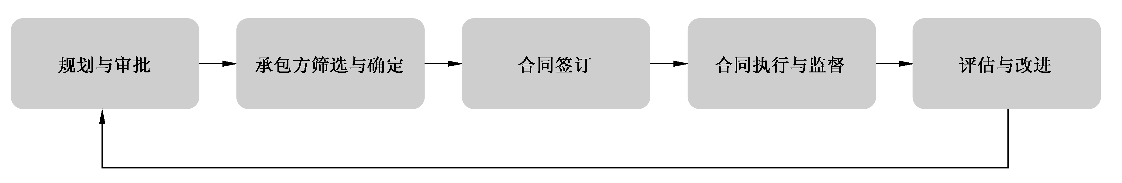 發(fā)包工作可分為規(guī)劃與審批、承包方篩選與確定、合同簽訂、合同執(zhí)行與監(jiān)督、評(píng)估與改進(jìn)5個(gè)步驟,如圖2所示。