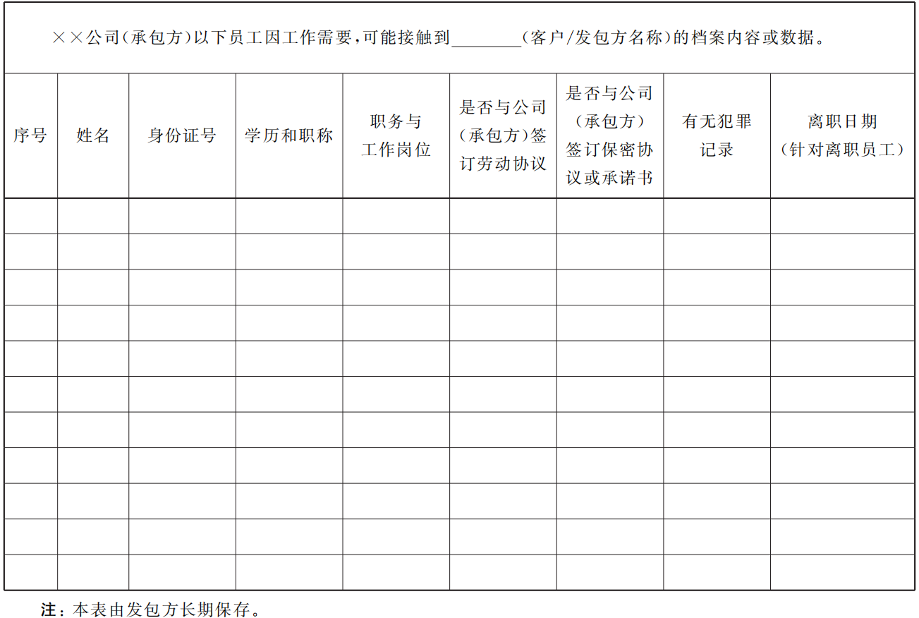 6.2.5.2 對(duì)于承包方員工進(jìn)駐發(fā)包方工作場(chǎng)地,或可能直接接觸到發(fā)包方檔案內(nèi)容或數(shù)據(jù)的檔案服務(wù)項(xiàng)目(如檔案數(shù)字化服務(wù)、檔案整理服務(wù)、檔案開發(fā)利用服務(wù)等),發(fā)包方應(yīng)將直接參與本項(xiàng)目的承包方員工名單予以備案,并對(duì)其進(jìn)行行為規(guī)范要求的交底或培訓(xùn),使其了解并遵守發(fā)包方的規(guī)章制度。承包方員工備案表由發(fā)包方長(zhǎng)期保存。承包方員工備案表樣式可參見(jiàn)附錄 B。