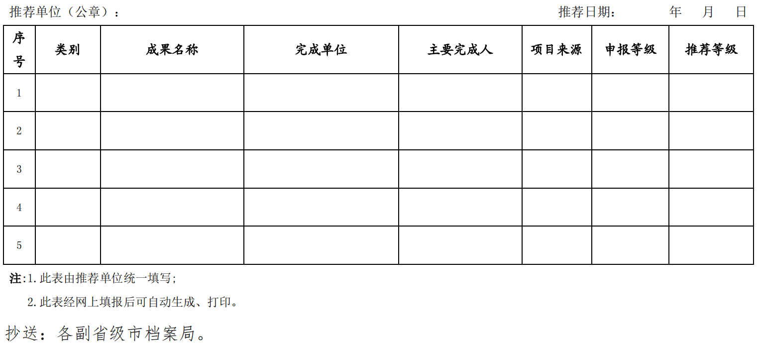 以上材料通過"檔案科技管理系統(tǒng)"填報(bào)并提交給國家 檔案局, 通過審核后打印、蓋章, 由推薦單位統(tǒng)一報(bào)送。